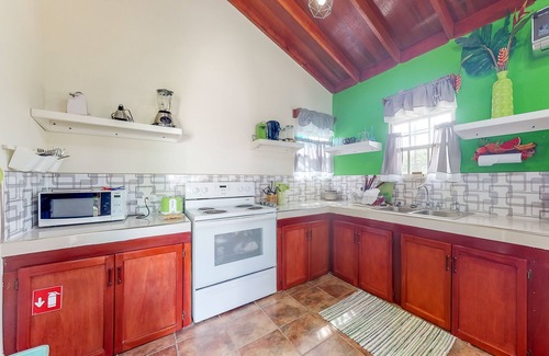 La Rana est une maison confortable pour toute la famille. Il a de l'espace pour tous, un salon spacieux, une cuisine complète et une grande table à manger. Sortez à l'extérieur du patio et profitez de manger en plein air ou d'aller au fond de la piscine pendant que vous profitez de la vue sur la jungle. La location comprend également le wifi gratuit, une télévision et une buanderie.
