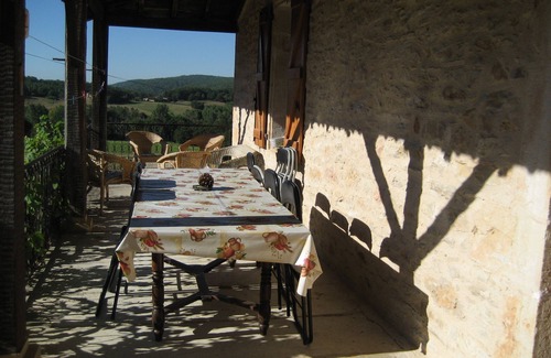 maison avec terrasse couverte équipée d'une table et des chaises pour prendre les repas à l'extérieur et un petit salon pour détente. Vue panoramique sur la campagne environnante et un petit village de caractère. Le site est calme et loin des voies de circulation routière. Cour privée avec possibilité de jeu de pétanques, les boules sont fournies. Les chemins de randonnée pédestre sont d'un accès facile.
