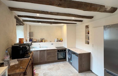 - Cuisine entièrement équipée, récemment rénovée, avec réfrigérateur, micro-onde, four, lave-vaisselle, machine à laver et machine à café.