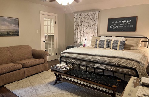 ElKen Retreat est une pièce privée attenante à notre maison. (Nous proposons également un autre espace - le pool house - avec 2 lits jumeaux et un canapé-lit derrière notre maison). Vous bénéficierez d'un merveilleux lit king-size et d'un matelas Serta sur un lit bébé qui peut être amené dans la chambre sur demande (supplément pour plus de 2 personnes).