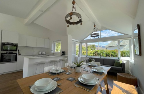 Off the entertainment space is the large kitchen diner. The kitchen has been newly fitted with clean, white marble worktops which gives it a modern feeling. The high-vaulted ceilings add to the feelings of space and the large windows to the rear of the room allow you to take in the beautiful garden and the fells beyond and the door allows access to the garden. The kitchen consists of a fridge/ freezer, oven and electric hob, dishwasher, kettle and toaster. There is also a pod coffee machine for your use during your stay. The kitchen also has plenty of storage for your belongings and a breakfast bar that sits 3 people. The dining table can sit 6 comfortably