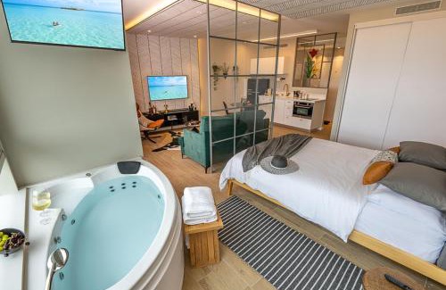Mina's luxury suite - panoramic sea view- קיסריה is a recently renovated aparthotel in Caesarea, where guests can makes the most of its indoor pool, private beach area and fitness centre. This beachfront property offers access to a balcony, squash on the squash court, free private parking and free WiFi. Guests also enjoy access to the sauna and hot tub, as well as the spa facilities and beauty services. The aparthotel features 1 bedroom, 1 bathroom, bed linen, towels, a flat-screen TV with cable channels, a dining area, a fully equipped kitchen, and a terrace with sea views. A private entrance leads guests into the aparthotel, where they can enjoy some wine or champagne and fruits. This aparthotel is non-smoking and soundproof. A bar can be found on-site, and in the warmer months you can make use of the barbecue facilities. You can play mini-golf and tennis at the aparthotel, and the area is popular for cycling and fishing. Mina's luxury suite - panoramic sea view- קיסריה has a children's playground and a picnic area. Caesarea Aqueduct Beach is 3 km from the accommodation, while Haifa’s Municipal Theater is 42 km from the property.