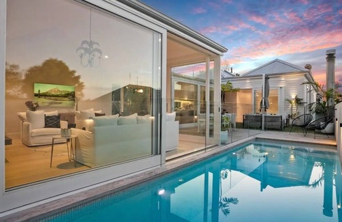 Renovated to perfection, this property is truely unique... Open plan living is unparalleled and seamless via large sliding doors opening the kitchen, dining, and two lounges on to a central courtyard with outdoor dining, fire and heated pool with large sun umbrella. Supremely stylish with every mod-con you will need to enjoy every aspect of your stay. Soak up the sun which is cleverly captured at every angle, dream away the day by the pool and dine with views of the Sky Tower.