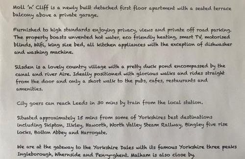This Moll’n’Cliff in Silsden is well equipped and has all facilities that have been listed below. Please note that these details were shared to us by booking.com for the listed “Moll’n’Cliff”. We solely rely on their shared details and are regarded as “accurate”. If you have any concerns about the information or accuracy describing this Appartement, please let us know.