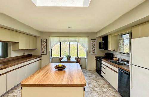 Le premier étage comprend un grand salon et une salle à manger, des plafonniers, des portes coulissantes en verre menant au pont; cuisine avec cuisinière, réfrigérateur, micro-ondes, lave-vaisselle et laveuse & sécheuse; Salle de bain complète hors de la cuisine; salon avec télévision par câble, chambre principale avec lit king et salle de bain privée; chambre à coucher avec deux lits jumeaux; salle de bain complète; garage une voiture et porte au niveau inférieur avec une grande salle familiale avec télévision par câble; chambre à coucher avec un lit double, chambre à coucher avec 2 lits jumeaux et une salle de bain complète. WiFi, Internet n'est pas garanti.