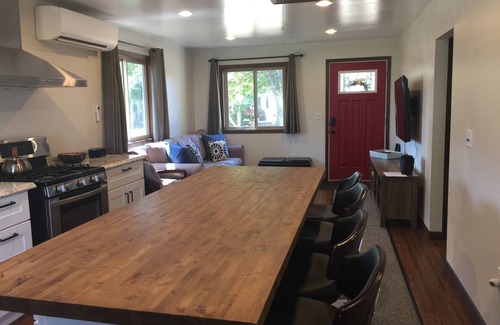 Mignon chalet confortable remodelé avec entrée privée et allée située sur notre propriété de 2 acres. Cottage peut accueillir 5. La chambre principale a un lit queen size. La deuxième chambre a un lit superposé avec un lit double avec un lit double sur le dessus. La cuisine a toutes les commodités dont vous avez besoin. Il y a un marché, une épicerie et une pizzeria à distance de marche. Cottage dispose d'une télévision connectée avec Amazon pour regarder des films, WIFI et un patio extérieur.