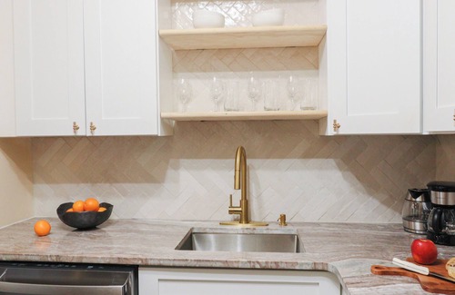 Step inside and be greeted by the warm tones of mid-century modern design. The soft taupe palette is accented with deep olive greens and rich earth tones that evoke a sense of calm and style. The hallway features a unique arched wall that leads to two inviting bedrooms, one with a gold Victorian-style king bed, the other with a cozy queen. Throughout the space, you’ll find a curated mix of antique details and contemporary fixtures: globe pendant lights, amber-glow wall sconces, and floating kitchen shelves for both function and flair.