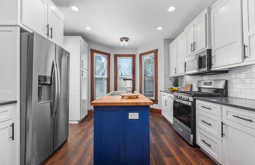 Guests can immerse themselves in the relaxed ambiance of this historic home by lounging on the porch swing, unwinding in the second-story sunroom, or indulging in the oversized rainfall shower. The house features a fully stocked, open kitchen, perfect for preparing meals together, and a large laundry room equipped with a washer and dryer for added convenience. With ample space for everyone to spread out and unwind, including a large backyard and a nearby park for kids, this farmhouse offers a comfortable and enjoyable stay.