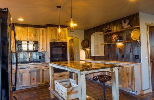 1 C Grange 16 personnes avec des espaces ouverts pour les soirées pyjama jusqu'à 25 (des frais supplémentaires de 10 $ / nuit / invité s'appliquent pour les fêtes de plus de 16 personnes, pour une occupation de 25 personnes pendant la nuit, le séjour maximum est de 3 nuits, la literie n'est pas fournie pour plus de 16 personnes). La cuisine gastronomique, la salle à manger et le salon combinés sont parfaits pour accueillir un groupe plus important. Cet espace comprend également une cheminée et un coin salon. En bas, il y a une salle familiale de télévision séparée avec un bar. Il y a 4 chambres privées (deux avec de belles salles de bains privatives), 2 salles de bains supplémentaires et une buanderie avec une laveuse et une sécheuse complètes. Pour dormir, nous avons 1 lit king, 1 lit queen, 2 lits doubles, 1 futon queen; 1 lit superposé (2 lits simples), 4 matelas simples pliants au sol ("flip chairs"), 1 grand canapé simple pliant, 1 canapé convertible en lit double et 2 canapés ordinaires. La maison n'a pas de climatisation car elle est située dans une zone de hautes plaines à une altitude de 7500 pieds et est équipée de plusieurs ventilateurs de plafond et de nombreuses grandes fenêtres pour permettre une bonne ventilation les jours plus chauds.