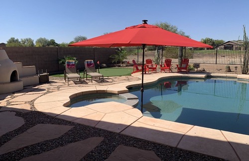 L'arrière-cour parle de lui-même! C'est un endroit merveilleux pour se détendre et profiter de votre propre piscine privée d'eau salée, bain à remous, foyer de style adobe et green de 3 trous nouvellement installé. Profitez de la belle vue sur le green du 12e trou de n'importe où dans la cour tout en profitant du barbecue Weber.