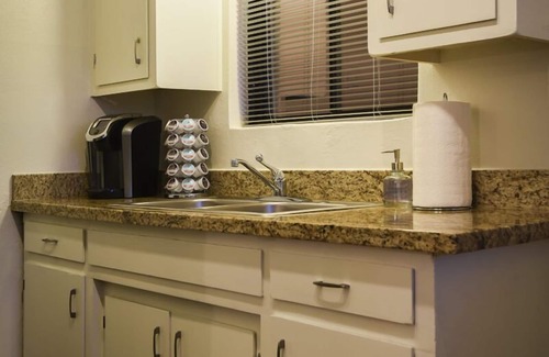 La cuisine a des comptoirs en granit, un réfrigérateur tout neuf, une cuisinière à gaz / four, un grille-pain, un ensemble complet de vaisselle, ustensiles de cuisine et tout ce dont vous auriez besoin pour cuisiner. Nous avons une nouvelle cafetière Keurig et de nombreuses saveurs de café et de thé. Nous fournissons également beaucoup d'eau en bouteille.