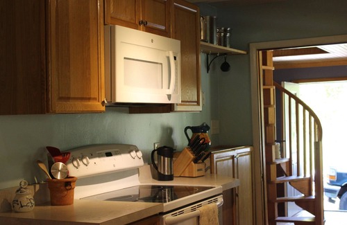 The kitchen has all the necessities- a stove, fridge, microwave, coffee pot, Keurig, crockpot, toaster, basic cookware and dishes. We keep the basics stocked- coffee, tea, sugar, olive oil, salt/pepper, and condiments in the fridge.