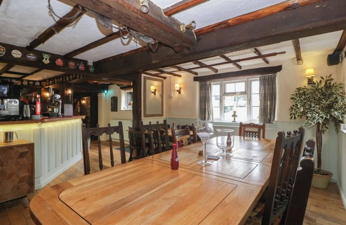 Penny Farthing Inn, pub, consists of a first-floor kitchen with oven, hob, microwave, fridge/freezer, washing machine, dishwasher, and air fryer, a living/dining room with woodburning stove, TV, and dining seating, a dining room with dining seating and darts board, a cinema room with surround sound, and a game room with a pool table. The bedrooms consist of four doubles, a double with en-suite shower room, a family room, and a family room with en-suite shower room, all serviced by two shower rooms. You'll find a shop and pub in 1.4 miles, and a river in 0.9 miles. WiFi, fuel, power, starter pack for woodburning stove, bed linen, and towels are included in the rent. Outside, there is a garden with lawn, patio, furniture, and play area, and ample off-road parking. Two well-behaved pets are welcome. Sorry, no smoking. All of this and so much more with a stay at the welcoming Penny Farthing Inn. Note: The property is a converted pub - the pub is still functional downstairs. A safety video is available on arrival. Note: Karaoke and a photo booth are available. Note: A good housekeeping bond is applicable at this property. Note: Men's and ladies' toilets are available. Note: There is a good housekeeping bond of 750 GBP