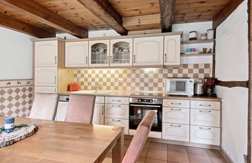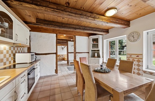 Spend your holiday amidst vast fields and forests in this traditional country house with a special charm. The house on the island of Rügen invites you to take a break in peaceful surroundings. Look forward to a lovingly furnished home with rustic wooden beams, a tiled fireplace and a cosy living atmosphere. The living area with large sofa offers space for relaxing evenings in front of the TV or with a book from the bookshelf. In the kitchen with dining table and classic equipment, you can prepare and enjoy regional dishes together. Relax in the sauna after long walks and soak up the warmth.