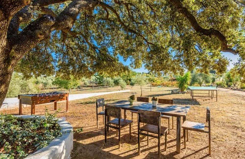 L'espace extérieur est une terrasse spacieuse dotée d'une belle piscine privée où vous pourrez vous rafraîchir pendant les chaudes journées d'été. Il y a un lit balinais pour passer au mieux vos soirées d'été, et un canapé berçant qui vous bercera pour de profondes siestes. Sans oublier l'espace extérieur pour les repas « al fresco », sur le porche, et celui à l'ombre d'un arbre centenaire. A proximité de ce dernier, vous et votre famille disposez d'une table de ping-pong et d'un baby-foot, pour vous adonner à des activités ludiques pendant votre temps libre. Il y a aussi des toilettes extérieures.