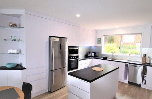 Pirralillia (belle colline) - Avec ses deux étages, ses deux balcons spacieux et sa grande terrasse à l’arrière du barbecue, vous ne manquerez pas de points de vue privilégiés pour admirer de superbes vues panoramiques. Il est rare de passer une belle journée en été sans voir les dauphins nager sous la maison. En hiver, vous pouvez observer les baleines lors de leur migration sur la côte. Manyana est devenue populaire grâce à ses belles plages préservées, à la proximité du lac Berringer pour le ski nautique et la pêche et aux nombreuses autres plages au nord de Bendalong. Cette propriété en bord de mer a deux de presque tout sur deux niveaux, deux salles de bains, deux espaces de vie (ou quatrième chambre). Dormez les enfants au rez-de-chaussée avec leur propre salle de bains et leur salon ou séparez les étages supérieurs et deux familles peuvent profiter de la vie privée à chaque niveau! Le choix t'appartient. Cet emplacement vous permet de vous rendre à pied aux plages d'Inyadda et de Manyana et à quelques minutes en voiture ou en pagaie de l'île Verte ou de la plage de Bendalong. Un court sentier (50 m) descend de la maison à Dulcies Beach et aux bassins rocheux. Consultez ce guide de surf local pour plus de détails sur les spots de surf dans la région. Le magasin et le café Bendalong sont situés à 20 minutes à pied ou à deux minutes en voiture de l’essentiel ou d’un repas rapide et facile. Il y a maintenant une vente à emporter à Cunjurong Point également. Explorez la ville historique de Milton avec ses cafés et ses boutiques à seulement 20 minutes. Ou visitez Mollymook pour une partie de golf. La plus grande ville d'Ulladulla se trouve à cinq minutes de Milton et propose plusieurs supermarchés, un cinéma et un bowling. Les activités locales telles que les courts de tennis, les terrains de basket-ball, un terrain de football et un skatepark situés à Manyana dans la réserve voisine de Yulunga (rappelez-vous du matériel BYO) ne manquent pas. Cette propriété est en forte demande constante en été. Réservez dès maintenant pour ne pas manquer! Caractéristiques: Cette maison de vacances offre Vues étonnantes des espaces de vie supérieurs et inférieurs Position surélevée bénéficiant de la brise de l'océan avec climatisation à cycle inversé et ventilateurs de plafond Salon et salle à manger ensoleillés avec un grand mur de verre pour profiter de la vue donnant sur la terrasse arrière à l'étage Chambre des maîtres avec des vues spectaculaires et un lit queen qui s'ouvre sur le balcon La deuxième chambre à l'étage supérieur a deux lits simples et la troisième chambre avec un lit double au rez-de-chaussée sont spacieuses et ont des peignoirs intégrés La grande salle de jeux en bas fournit un deuxième espace de vie et a un lit queen supplémentaire, 2 lits simples (une avec un lit gigogne) Deux salles de bains (une récemment rénovée) avec douche, toilettes, lavabo et sèche-cheveux. Salle de bain principale a une douche spa avec 6 jets et 4 jets de pied Douche froide extérieure. Espaces salon avec fauteuils Lay-Z-Boy inclinables et deux télévisions à écran plat (un à l'étage, un en bas) Cuisine entièrement équipée avec cuisinière électrique, four et lave-vaisselle ainsi que tous les appareils électroménagers dont vous aurez besoin d'une bouilloire, d'un grille-pain, d'une machine à café à capsules pour boissons multiples EXPRESSI - (BYO pods aldi), four micro-ondes Double garage pour ranger vélos et matériel de surf Lave-linge par le haut dans la