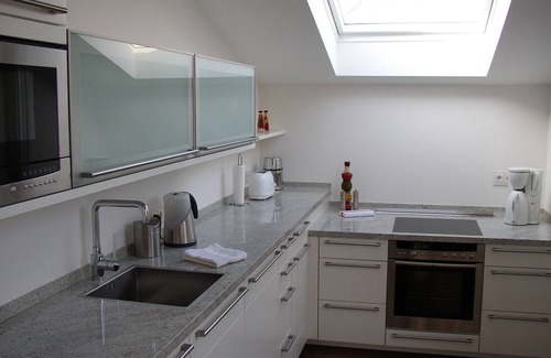 Appartement non-fumeur élégant et meublé avec élégance avec 3 balcons, cheminée, grand salon-salle à manger, une chambre avec lit double 1,80 mx 2,10 m, cuisine séparée avec table à manger u. Canapé d'angle avec zone de bronzage d'environ 1,40 mx 2,20 m, une salle de bain accessible par la chambre avec une grande baignoire ronde et une douche, chauffage par le sol dans toutes les chambres. Visite virtuelle sur notre site possible.