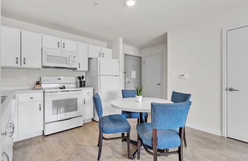 Step into this beautifully furnished 2-bedroom apartment featuring sleek modern design, a plush queen bed, TV, fully equipped kitchen, beautiful couches and in-unit laundry .All bedrooms have bedside lamps. Enjoy natural light, cozy living space, and a peaceful vibe—perfect for extended stays. Centrally located with easy access to shops, dining, and transit!