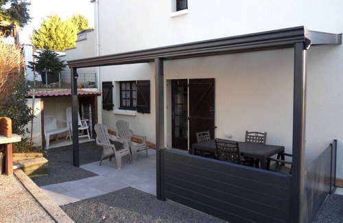 • 2 Terrasses, avec Pergola Alu :Salon de jardin, 2 Fauteuils, Barbecue fixe, Transats, Parasol
