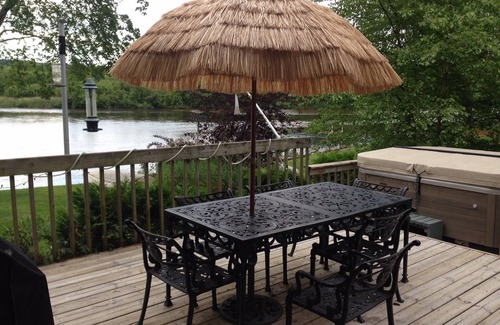 Louez ce chalet joliment meublé pour profiter de la beauté de la nature sur la rivière Wisconsin et le lac Wisconsin dans ce chalet riverain rustique et confortable. Belle vue sur les grandes fenêtres du salon donnent sur les îles de sable vert et les rives lointaines non développées de la rivière Wisconsin comme il ouvre sur le lac WI. Beau nouveau bain à remous pour 4 personnes et un sauna en céramique pour 2 personnes sur le pont avec une vue magnifique sur la rivière et les collines.