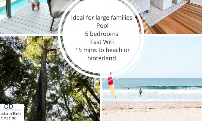 This home is a stunning, modern beauty and contains everything you need to entertain the kids but also pamper yourself and relax in a private and natural setting. This space is perfect for your luxurious and relaxing holiday, work trip or family reunion. This spacious 2 storey, 5-bedroom 2.5-bathroom home sleeps 10 people and offers a choice of several indoor and outdoor entertaining spaces and two lounge rooms, both equipped with large smart TVs. This property includes a parents retreat, with ensuite (it also has a bath). You can choose between two lounge room areas, not to mention a covered outdoor entertaining area upstairs and another downstairs by the pool. If you do manage to get the kids out of the pool, they can stream a movie in one loungeroom, whilst you catch up with your family in the other, or the kids can enjoy the Sunshine Coast tropical climate and explore the large, grassed yard with a trampoline, soccer goals and a sandpit.