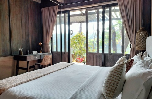 This dreamy waterfront villa is located in a sprawling one-acre property. Its two bedrooms offer views of riverside banks, calm lush forests, and nearby hills. The lodge weaves a timeless experience with elegant interiors and a luxurious pool deck.