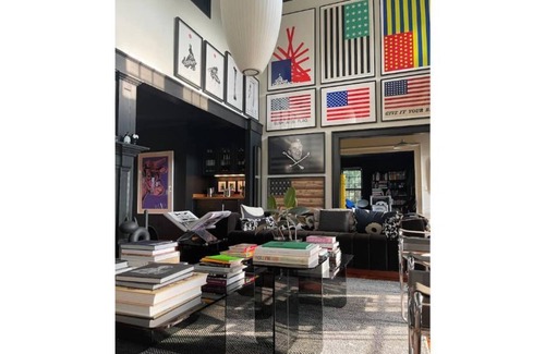 The farmhouse was built in 1840 and is a spacious, light-filled home with sweeping views of rolling hills and the Hudson river. The house has 3 bedrooms, many living rooms, a movie room, a gym, and a giant kitchen and dining room. The home features a world class collection of art and vintage posters, over 200 original works by Andy Warhol, Ellsworth Kelly, Alex Katz, Joshua Vides, Jeff Koons, Shepherd Fairy, James Victore, Alexander Calder, Keith Haring, and more. The design collection is stellar including clássico by: Alessi, Eames, Saarinen, Herman Miller, Marimekko, Prouve, Vitra, Girard, Breuer, Kartell, Hem, Panton, Vitsoe, Rams, Jacobsen, Jongerius, Flos, and Tom Dixon. SOME of this art is homoerotic as well as politically charged. Please take note of this. There is central heating and cooling with Nest thermometers and Yale door locks in the house.