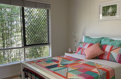 Looking out over the bushland from the balcony, you could be anywhere. Being at the end of a cul-de-sac means it is very quiet. Free standing, two storey house, 1 bedroom with double bed a bright living / kitchen area and fully enclosed private garden. Free street parking. 20-minute drive to Brisbane city and 15-minute drive to Brisbane airport.