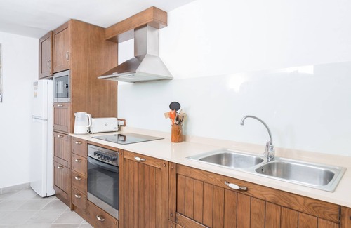 The house is distributed over two tastefully decorated floors. The entrance hall leads to the dining room and the kitchen. The first one, has a Mallorcan style palpable in its natural stone walls and rustic furniture, which includes a large table with designer chairs to sit and eat together. After three steps and a large archway, we access the kitchen, equipped with rustic furniture, induction, oven, microwave and everything you will need to cook like at home. On this floor there is a bedroom with a double bed and wardrobe, as well as a separate bathroom with shower. Going upstairs we reach a beautiful living room, where you can watch satellite TV on the sofas, listen to music on the CD player or read a book in the rocking chair, accompanied by the scenery and the air conditioning. Here we have two further bedrooms, one with a double bed, a/c, space for a cot and highchair, and en-suite bathroom with shower. The other has a bunk bed and wardrobe. Five radiators and a separate laundry room with washing machine, iron and ironing board complete the equipment.