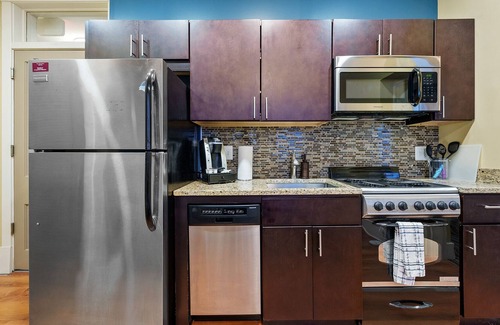 The unit features a cozy living room with a comfortable sofa, a flat-screen TV, and plenty of natural light. The bedroom boasts a plush full-size bed, a dresser, and a closet for ample storage. The bathroom is clean and modern with a shower/tub combo. The fully-equipped kitchen includes a refrigerator, stove, microwave, marble countertops, and coffee maker, along with all necessary cookware and utensils. Not to mention in-unit laundry!