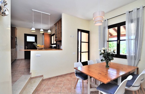 Il a un jardin, salon de jardin, terrain clôturé, terrasse de 30 m², barbecue, cheminée, fer à repasser, accès internet (wifi), sèche-cheveux, chauffage par pompe à chaleur, piscine privée, parking extérieur dans le même bâtiment, TV satellite (Langues: espagnol , Anglais, allemand).