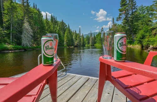 En été, vous pouvez nager ou faire du canoë dans la rivière, accessible depuis la plage et le quai privé du chalet.