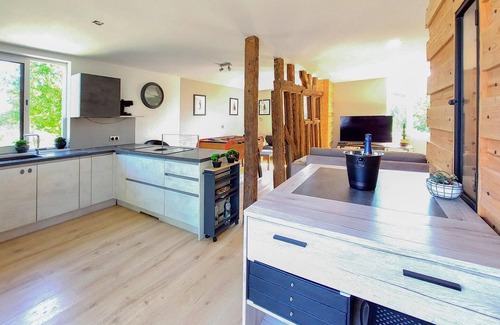 Welcome to this beautiful house, which offers all the conditions for a great time with the family. The modern interior and bright rooms, which get their warm expression from numerous wooden elements, make it a cozy place with space for joint activities. Enjoy meals together at the long dining table and look forward to cozy evenings, for example with a family duel at the foosball table.