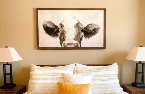 ‣ Rustic-style retreat; a guest favorite with your sweet Bessie, the cow, on the wall
