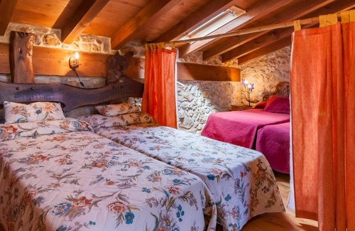 "El Pajar", 3-room house 80 m2 on 1st floor. Rustic furnishings: living/dining room with open-hearth fireplace and digital TV. Exit to the balcony. 2 rooms with curtain, each room with 2 beds (80 cm, length 185 cm). Open kitchen (oven, 2 ceramic glass hob hotplates, microwave, freezer) with dining table. Shower/WC, hydro massage shower. Wood heating. Large porch. Terrace furniture, covered balcony. View of the mountains and the river. Facilities: washing machine, iron, hair dryer. The rustic style house has been completely renovated and is situated in a lovely farm of 2 hectares with a river (it is possible to go trout fishing) which crosses the farm. Ideal situation for relaxing. The porch is throughout the entire lower floor. R000000001