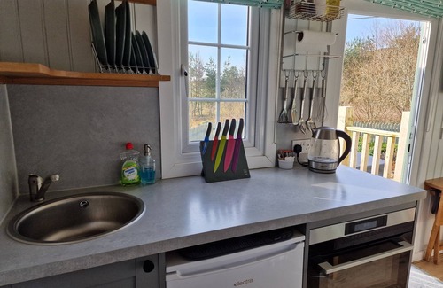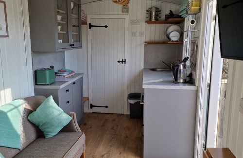Shepherd’s View (which at 22ft x 8ft is slightly larger than most) has a double bed with luxury mattress, en-suite shower-room with electric shower, loo and wash-basin, fold-away dining ledge & stools, snuggle sofa, freesat TV, electric heating and a wood burner for romantic evenings. The perfectly formed kitchen area includes a built-in microwave, standard size fridge with small freezer compartment, induction hob, kettle and toaster, as well as a good selection of cooking and dining equipment.