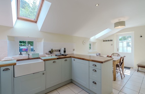 A bright and airy space to enjoy cooking and eating. The well equipped kitchen has a beautiful electric AGA cooker, dishwasher, under counter fridge and mini freezer, Nespresso coffee machine and filtered tap water. There is also a combo microwave, kettle and toaster. The dining table has seating for four. There is access to the back garden through the back door and space for hanging coats and leads and storing shoes and boots.