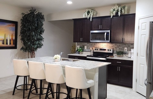 This Maricopa house boasts 4 inviting bedrooms, including 2 king beds, 1 queen bed, and 1 full bed along with 2 full baths and an office space with a pull out sofa.The cozy living space is perfect for guests looking for a serene retreat. With amenities like heating, AC, a hairdryer, and an iron, your stay will be as pleasant as can be. We also offer a large blackstone grill for cook outs and entertaining. If its a quick breakfast you like we have provided options like yogurt, breakfast cereals and oatmeal for a no hassle breakfast. This is a brand new home with brand new furnishings for you to be able to relax in comfort and style. The home has never been smoked in or had any pets in so it is in pristine condition. This home is located just across the street from the Copper Sky recreation center which offers a variety of amenities including multiple pools that include lap pools and water slides along with a stocked pond for fishing and paddle boat rentals. It also boast a state of the art fitness center and basketball courts . The home is also located a short mile and half away from the Ak- Chin casino where you can gamble, visit the movie theater, go bowling or simply enjoy the upscale steakhouse inside the casino. This beautiful home is also in a prime location for all the shops and restaurants that Maricopa has to offer including wal- mart just 3 miles away.
