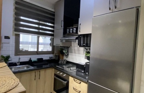 L’appartement est spacieux et lumineux, il dispose d’une jolie entrée avec un meuble de rangement fonctionnel pour sac chaussures et clés ,un énorme miroir sur tout le mur ,un grand salon climatisé avec un grand canapé confortable et une grande télé connectée avec un wifi et Netflix gratuit une table basse et un coin café avec la machine à café Nespresso,une cuisine ouverte sur le salon totalement équipé avec toutes la vaisselles nécessaires ainsi que des appareils électroménager de hautes gamme tel que réfrigérateur et frigo,micro ondes, cuisinières 4 feu et four électrique grille pain et bouilloire ,blender etc….et une table bar avec chaises hautes également et les produits ménagers sont fournis.