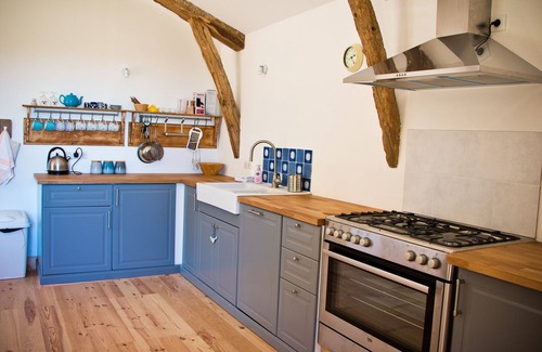 Il y a une grande cuisine ouverte avec four, évier de ferme, réfrigérateur, congélateur et lave-vaisselle. Dans le même espace ouvert se trouve un grand espace salle à manger et salon avec poêle à bois pour les nuits d'hiver et une grande fenêtre et de belles vues orientées plein sud. Une télévision avec chaînes satellite britanniques est disponible, tout comme un lecteur DVD et multimédia Blueray ainsi que de nombreux DVD. Sous la grange se trouve une zone de stockage pour les valises des invités, les vélos, etc. ainsi qu'une machine à laver.