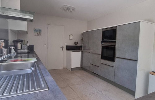 Cuisine équipée : Réfrigérateur – Four – Micro-Ondes – Lave-Vaisselle – Plaque à induction – Grille-Pain – Bouilloire – Cafetière à filtre – Cafetière compatible Nespresso – Rangements - Tabourets