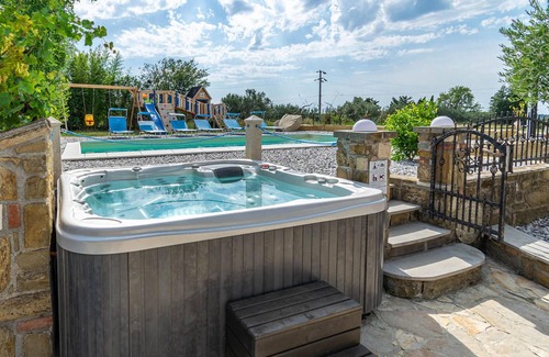 Dans la cour intérieure, il y a une grande terrasse et un jardin, complétés par une belle piscine, une terrasse couverte avec une cuisine extérieure et de nombreuses installations sportives et pour les enfants. Une grande niche est également prévue pour vos amis à quatre pattes. En accord avec le propriétaire, qui produit de l'huile d'olive et du vin, il est également possible d'acheter des produits régionaux.