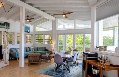 Le salon de Vela Vista est spacieux et lumineux avec de hauts plafonds et de grandes fenêtres. Le plan d'étage ouvert offre beaucoup d'espace pour se détendre et s'imprégner de l'ambiance insulaire. Faites fondre dans un salon de pouf, blottissez-vous avec un livre dans un siège de fenêtre de forme triangulaire, ou grimpez (et ne partez jamais!) la balançoire confortable pour hamac intérieur. Vous pourrez vous détendre la nuit, regarder un film sur le canapé ou avec un jeu de société passionnant de notre collection de jeux!