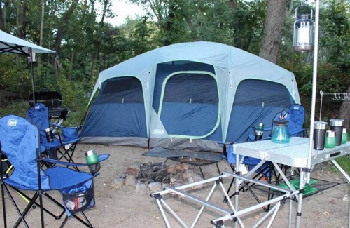 This Tentrr site is outfitted with an extensive range of Coleman camping gear. Unwind in style with a large cooler, grill, shade canopy, lanterns, speaker, camp chairs, wagon, and more! (Campers must bring their own pot/skillet, cooking/eating utensils and plates.)