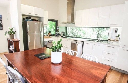 The open plan living area features a wood fire and TV/DVD/Ipod as well as reverse cycle heating/cooling. Open out onto the huge deck with Gas BBQ setting or cook up a storm in your fully equipped kitchen with quality Smeg appliances - or start the day with a Nespresso before a short stroll to a delicious cafe breakfast.