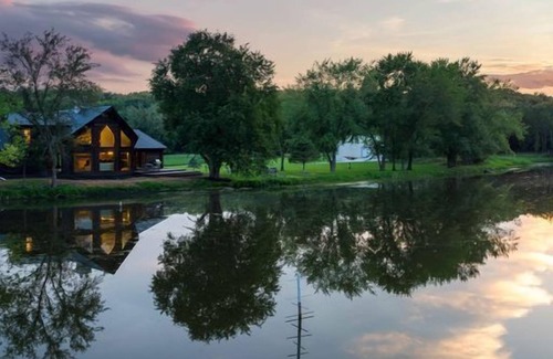 Luxury log cabin nestled on 120 acres with 5 acre stocked pond for catch and release, creek that runs through the propertyand fire pit.