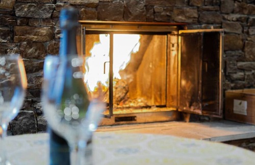 The kitchen is equipped with an oven, a stovetop, and a refrigerator, as well as a coffee maker, a microwave, and cookware. Bathroom amenities include a hair dryer, towels, and toilet paper. And you can even pack a bit lighter because there's a washer and dryer. Other amenities include a fireplace, bed sheets, heating, and a dining table.