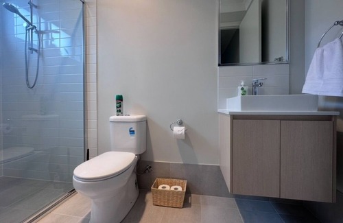 Connecting to the bedroom is the bathroom with a large shower, good pressure and hot water. Amenities such as shampoo, conditioner and shower gel are available to use if you forget your own.