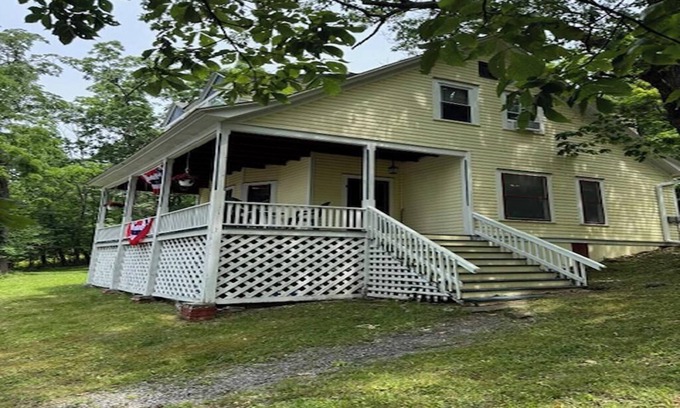 There is a lovely porch, a back patio, a comfortable living room, a dining room with a table for 9 and a well equipped kitchen. On the second floor in the main house, you will find 4 bedrooms and the half bathroom. Harriet’s Room has a queen bed with a window air conditioner. The Children’s Room has 2 twin beds and the Blue Room has 2 twin beds. The Yellow Room has 1 twin bed. The bathroom has a sink, toilet and old fashion claw foot tub. In order to get to an extra room that is attached to the side of the house, you walk out the kitchen door, go 8-10 steps and walk into the Albert Lyman Room. There you will find a bedroom with a queen bed and the bathroom with a shower, toilet and sink.