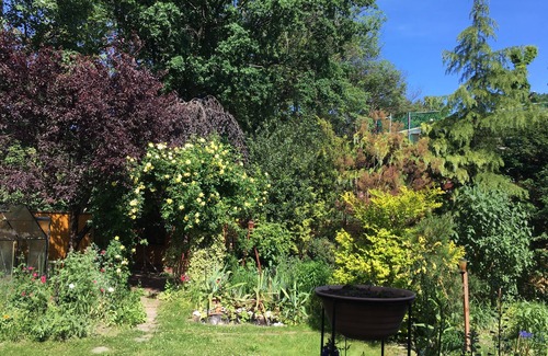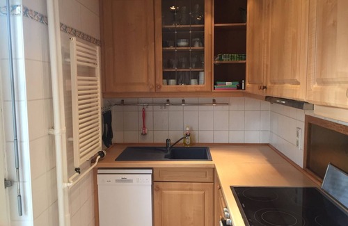 The apartment extends over 2 floors and offers a lot of rustic comfort with its 3 bedrooms with a total of 8 beds. We are happy to accommodate 1-8 sleeping guests, there is also a high chair, a step stool and a toddler bed available on request. The bathroom has a shower and a cozy corner bath! You will find a well-equipped kitchen with a microwave, kettle and all the important utensils you need for cooking. There is also a second guest toilet on the lower floor. Children can use provided toys and art supplies, romp and swing in the garden. On request, we will be happy to open the small garden gate to the park (but you can also reach it via a small detour in 3 minutes on foot).